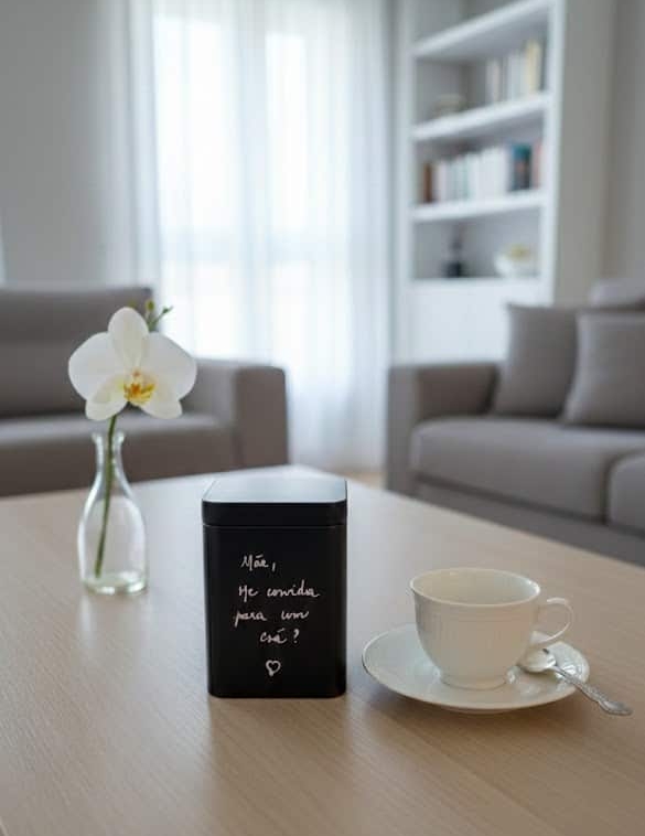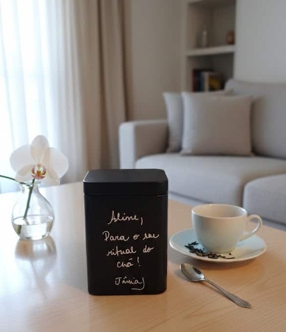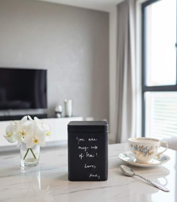 A lata preta fosca e elegante permite escrever a sua frase e deixar como um cartão para surpreender quem ama chá.